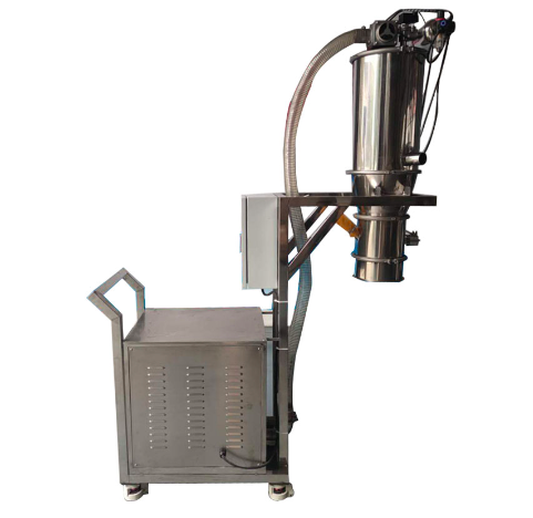 真空上料機是用真空泵抽氣,使吸料嘴進口處及整個系統(tǒng)處于一定的真空狀態(tài),粉粒料隨同外界空氣被吸入料嘴,形成料氣流,經(jīng)過吸料管到達料斗,在料斗中進行氣、料分離。分離后的物料進入受料設備。輸送、放料是通過氣動三通閥不斷地開、閉來完成的,而氣動三通閥的開閉是由控制中心來控制的。 ZKS 真空上料機中裝有壓縮空氣反吹裝置,每次放料時,壓縮空氣脈沖反吹過濾器,把吸附于過濾器表面的粉末打落下來,使吸料能正常運行。